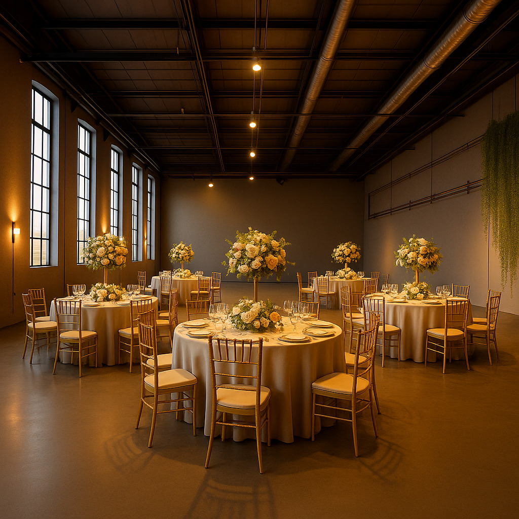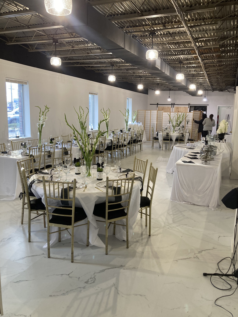 Flexible options Can be emptied out for open space or included with chairs & tables - small counter area , Fridge and prep area and 4 bathrooms in house Ladies / Men separate