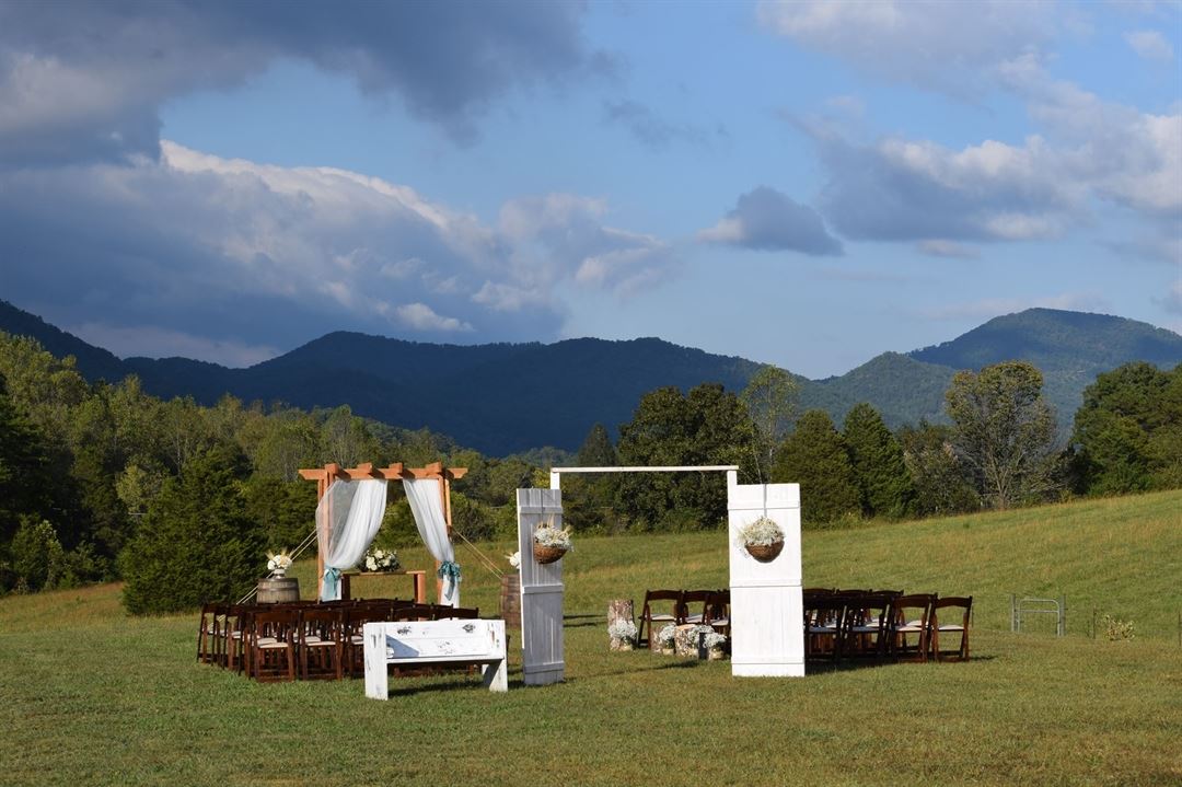 Open year round, Country Manor Acres is 50 beautiful acres in Townsend, TN, at the entrance to Great Smoky Mountain National Park.. There are s several outdoor sites for garden weddings and receptions as well as our Appalachian style party barn - a rustic wood structure with crystal chandeliers and Christmas lights all around.. This is a perfect setting for your corporate event, Bar Mitzvah, or Wedding. We can accommodate up to 300 guests. The landscape includes lush, green meadows with horses grazing in the background, spectacular mountain views, a pond with a huge, graceful Weeping Willow Tree, a level hillside with 360 degree view, intimate wooded sites, a landscaped rock garden, the veranda at the Country Manor Inn, or our Appalachian style party barn. The varied features of Country Manor Acres lend themselves perfectly for games and activities for family reunions, weddings and corporate team building challenges.