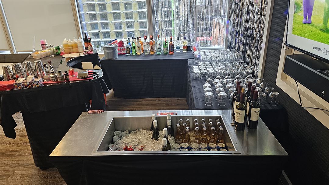 event staff and bartender. capable of serving over 250 guests. portable bar and beer tub and glasses. custom cocktails to match your theme.