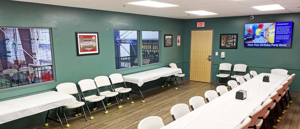 Indoor sports, function and event center with over 110,000 sf of available space in two facilities in Tyngsboro, MA The facility is located directly off Rte 3 and includes two basketball courts, four large turf fields, three large birthday/event rooms, a large mezzanine area able to seat over 250, batting cages, and other amenities that make it the perfect venue. An outdoor turf field and large area for outdoor events including barbeque, inflatables and more. Air conditioned for summer events and a full liquor license. Catering available or bring your own food.