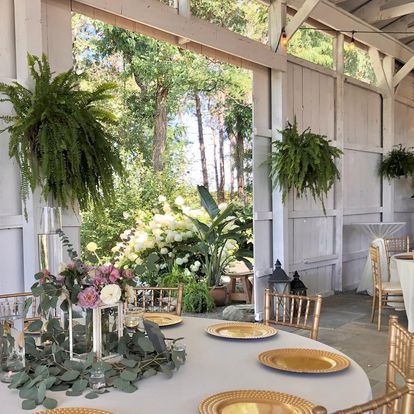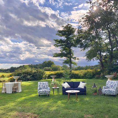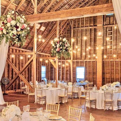 We offer 52 acres of fields, woods, rolling mountain ridges and manicured gardens. We include a gorgeous ceremony garden with benches and your choice of several arbors. Decor, Chandelier and string lighting, cocktail tables, farm tables, round tables, Chiavari chairs with leather pad, beautiful restrooms, six seater white gold cart, four bars, refrigerated coolers, ice, staff, groomsmen lounge and farmhouse accommodations.