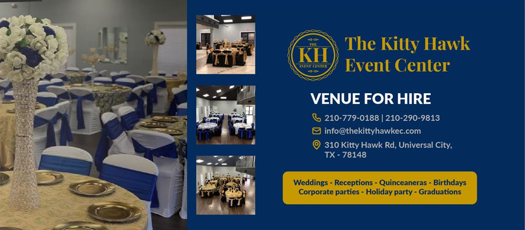 The Kitty Hawk Event Center (veteran owned and operated) offers a one-of-a-kind space for everything from business meetings to weddings, Birthday Parties, to graduations celebrations, Sweet 16 to Quinceaneras. Whether you prefer an intimate affair or a large event, The Kitty Hawk Event Center will help you create an experience that you will treasure for a lifetime! We offer "One Stop Shopping" with Full event planning, Catering, Linens and Decor, DJ and Photo Booth services, and Full Bar are available.