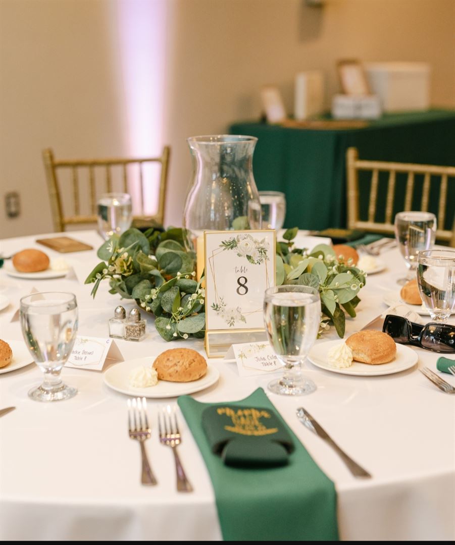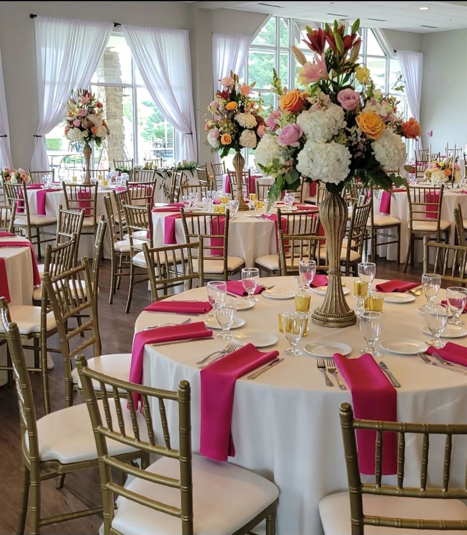 Piney Branch Golf Club is dedicated to creating a beautiful and stress-free celebration for every event. We offer an elegant ballroom that can seat up to 250 guests, with Gold Chiavari Chairs that over looks our stunning golf course. Our picturesque covered pavilion is draped in bistro lights for cocktail hours, ceremonies and seated events. The 18-hole course is the perfect backdrop for weddings, special events, golf outings, and all other celebrations. We'd love to host you!