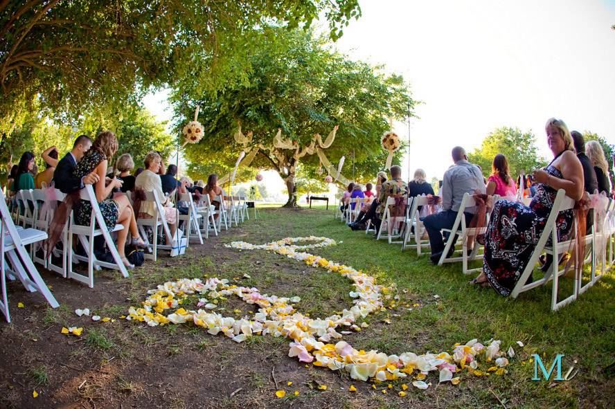 Surrounded by lush green hedges, our event area is shaded with mature trees. It is highlighted with greenery and flowering plants, giving you a backdrop to personalize how you wish. The venue includes a stage and an expansive lawn that can accommodate both large and small groups. There are other areas around the farm that can also be used, depending on the type and size of event you are hosting.