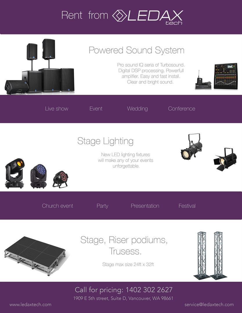 LED Wall, Stage, Lighting, Sound equipment rentals and sale.