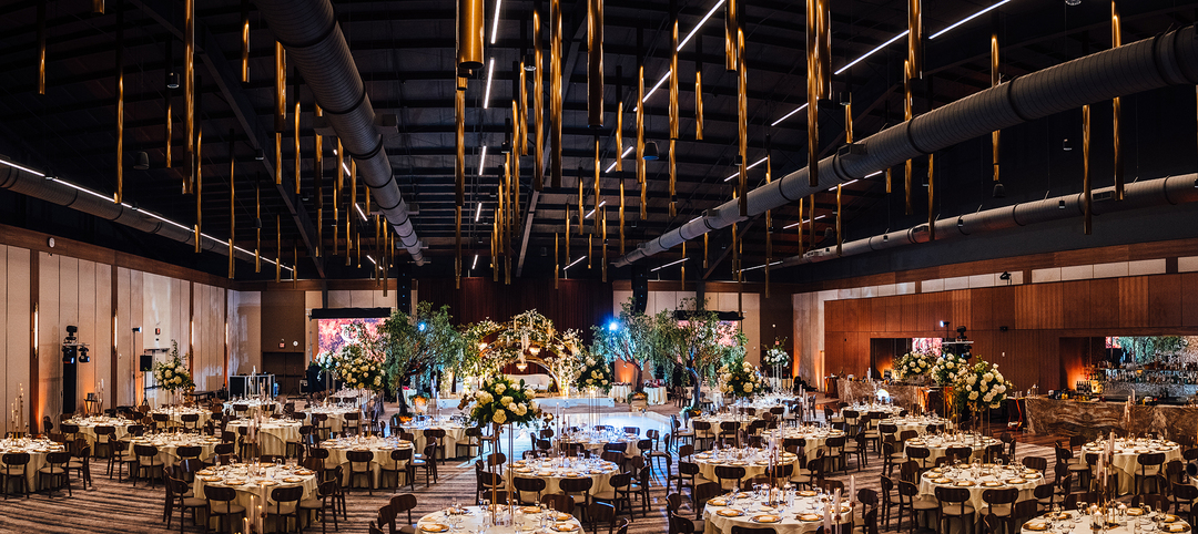 The room's design features an open plan with high industrial ceilings and a color palette of grays and creams with wood paneling. Two stunning bars made from dramatic vendome stone with mirrored walls of glass shelving complement the stylish decor. The venue's organic and serene color palette suggests the influence of a modern space morphing with nature.