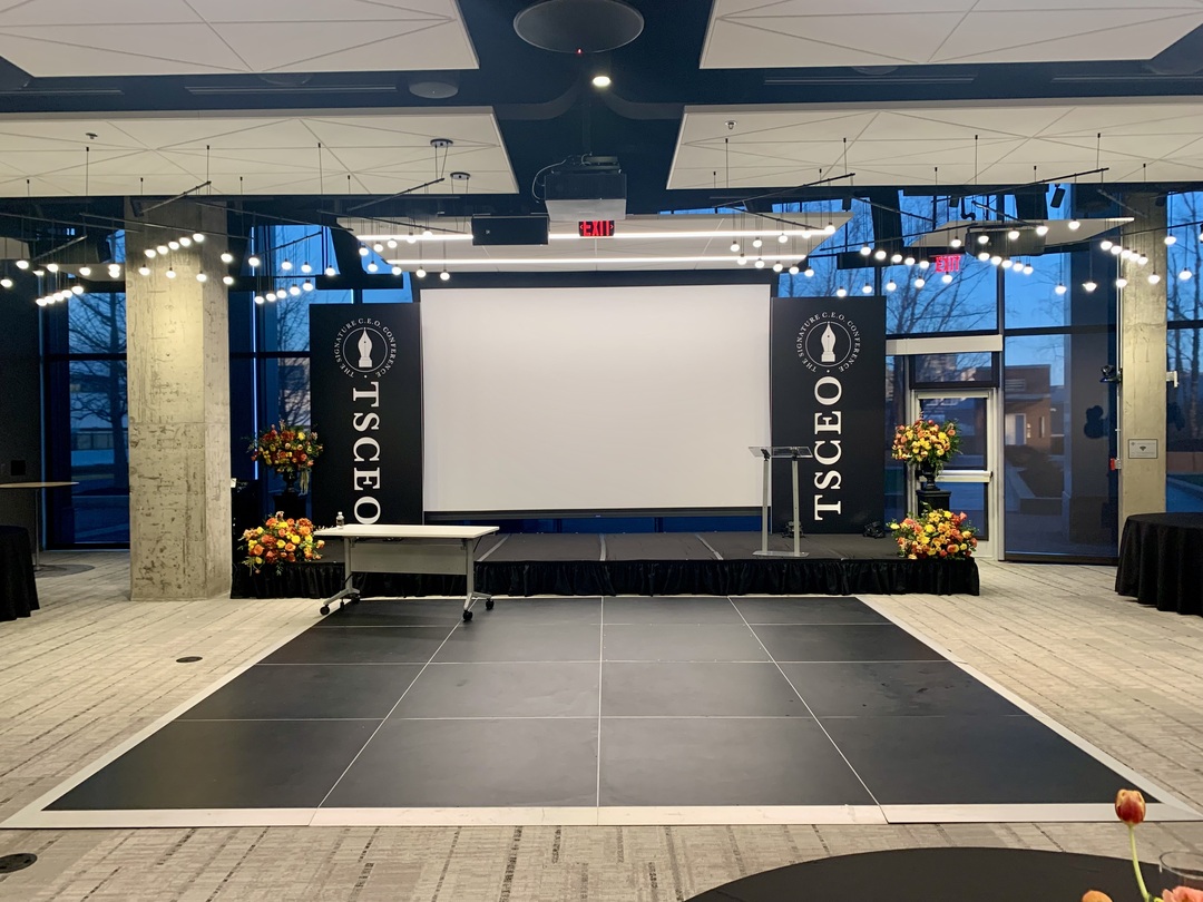 Complimentary WiFi, projector/screen, monitors, microphones, and presentation connections are available. Catering can be coordinated and set up in the lobby area directly next to the room for breaks, meals, and receptions.