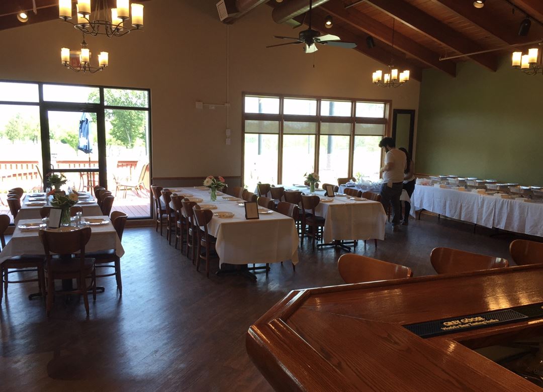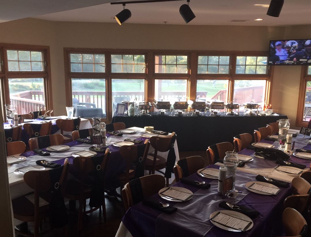 A private setting with magnificent views of the golf course, Personalized event planning, Full-service bar, Intimate fireplace, Outdoor deck and dining area. Accommodates up to 80-90 guests with an additional 25-30 with outdoor seating, weather permitting.