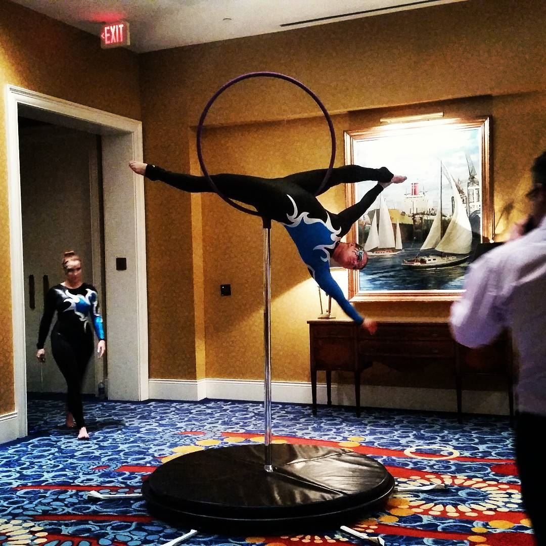 Airotique aerial dance company offers solo and group performances in the aerial and circus arts such as aerial silk, lyra, static and dance trapeze , acro, lollipop and cube.