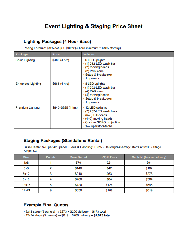 - provision and booking of Disc Jockeys for activations, sound equipment rental with engineer provided, event lighting and performance staging (plan, prep, delivery / installation, management and breakdown)