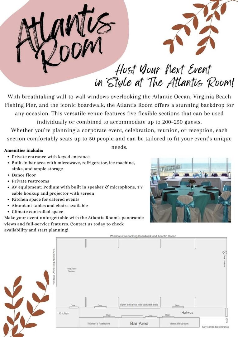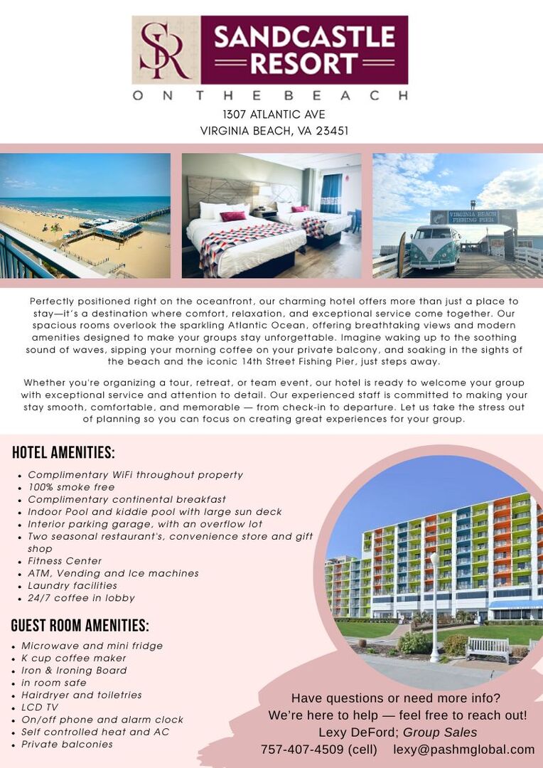 Sandcastle Resort offers the perfect blend of location, convenience, and coastal charm for your next event. Situated directly on the Virginia Beach boardwalk, our resort provides stunning oceanfront views, flexible event space, and on-site catering options tailored to your needs. Guests will enjoy comfortable accommodations, two restaurants, and easy access to local attractions—all just steps from the sand. With our dedicated team ready to ensure every detail runs smoothly, Sandcastle Resort is an ideal choice for memorable meetings, banquets, and group gatherings. Contact us to learn more about pricing and availability.