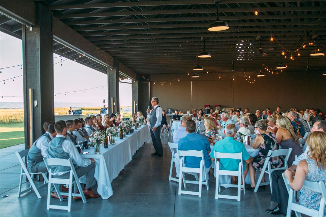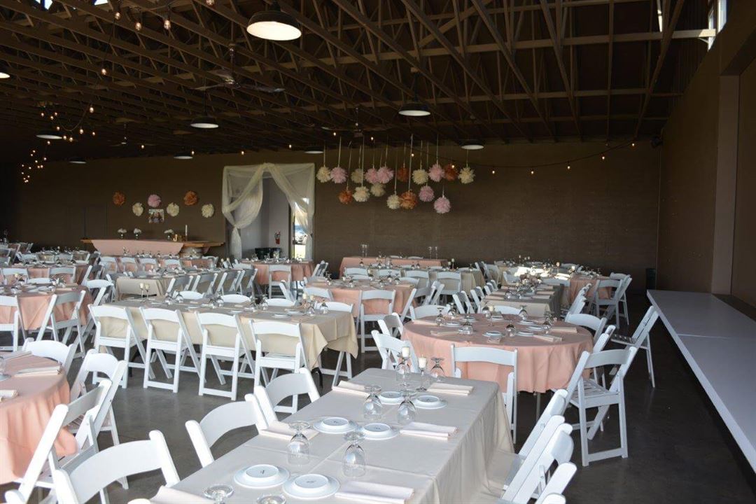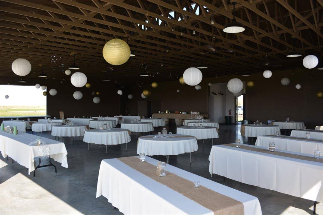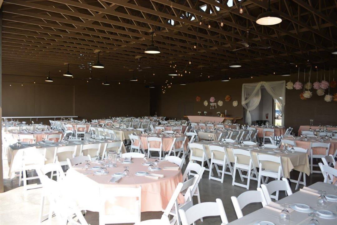 The dimensions of the building are 62' x 70' with capacity for 250 seated guests inside. It has an “open air” feel with the surrounding lawn area, open trusses on the ceiling, roll-up glass doors in the front, and sliding panels on each side. The "garage style" glass doors and sliding panels make it possible to turn our “open air” venue into a weather protected indoor party in just minutes. For additional information or to check availability, please contact us!