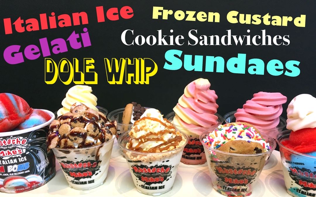 Mustache Mike's Italian Ice caters a variety of delicious mouthwatering tasty treats... * Italian Ice Cream * Dole Whip (Pineapple, Strawberry & Mango Soft Serve) * Gelati (Italian Ice + Frozen Custard) * Frozen Custard Sundaes with Toppings * Custard 'Ice Cream' Cookie Sandwiches We have multiple trucks & catering carts that can cater for any special occasion where we can do both outdoor or indoor types of events ~ Weddings, Bar Mitzvas, Corporate Functions, 'Ice Cream Socials, and everything in between! Hire us for your next Bay Area Ice Cream Catering needs!