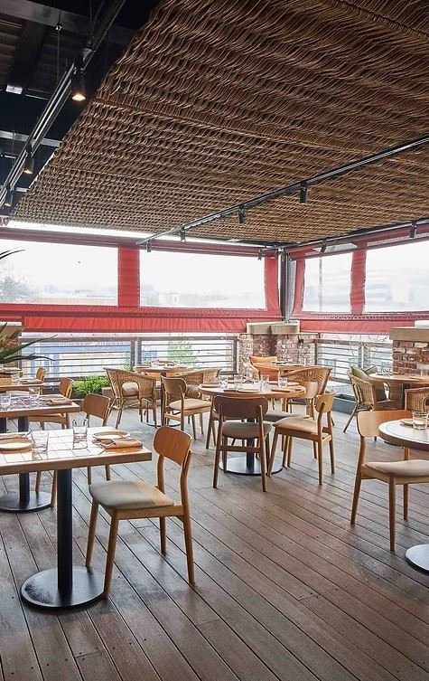 The 3,800 square foot restaurant is on the second floor of the new, three-story building in downtown Walnut Creek at 1500 Mount Diablo Boulevard. It has sharp angles, industrial steel elements, and modern lines. It is softened by a cohesive design concept with many curves. The energetic approach is evident the minute your guests enter the space. The main dining room has an open kitchen on the guests left, counter seating on the right, and a colorful tiled wall straight ahead. The large operable windows lining the restaurant and the private dining room let in ample amount of natural light. The space is interconnected perfectly with decorative light fixtures of varying sizes and shapes.