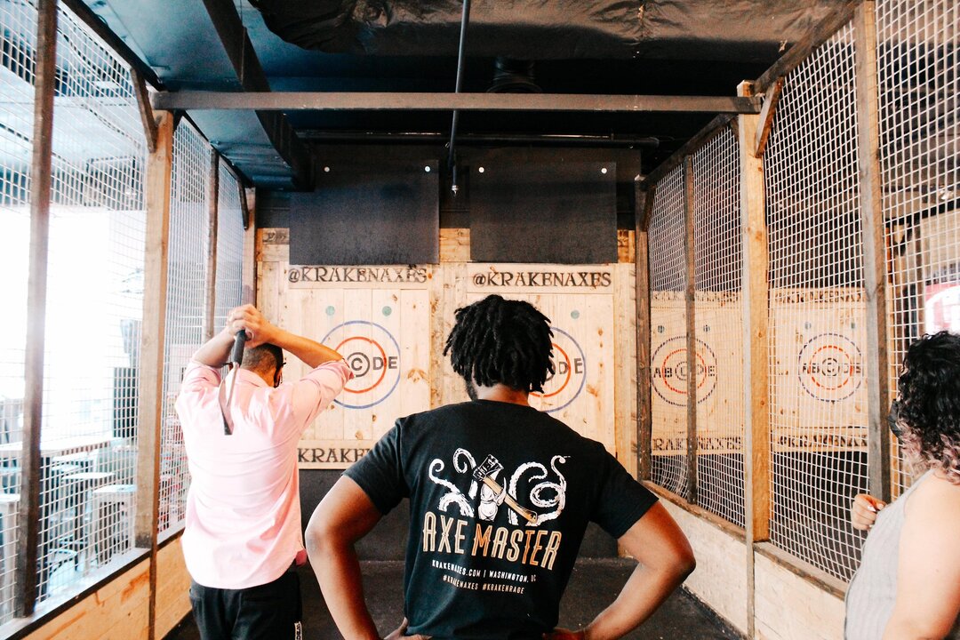 Located in the heart of Penn Quarter, our original Kraken venue offers eight thrilling axe-throwing lanes where guests can unleash their inner lumberjack. Each axe arena features a dedicated seated area, perfect for hanging out, enjoying drinks, and adding some friendly heckling as others aim for the bullseye. Plus, our bar service offers a wide selection of beers, wines, and cocktails to keep the good times rolling.