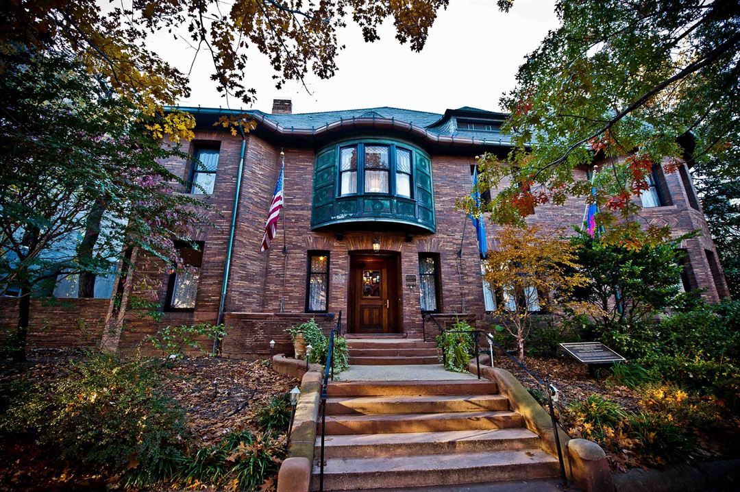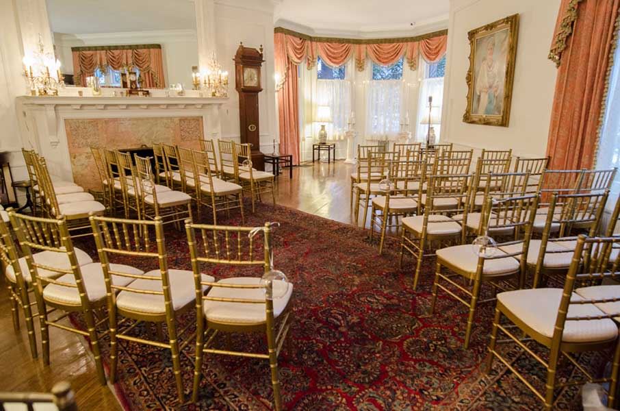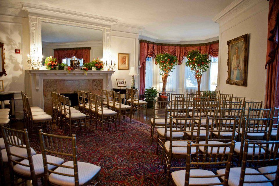 Nine enchanted rooms of varying size make the space an ideal setting for private parties, weddings and special events. Each is unique in character and beautifully furnished with antiques, art and political memorabilia. The mansion is special in that none of its public rooms are square or rectangular. A charming courtyard also provides a comfortable outdoor setting for guests to enjoy.
