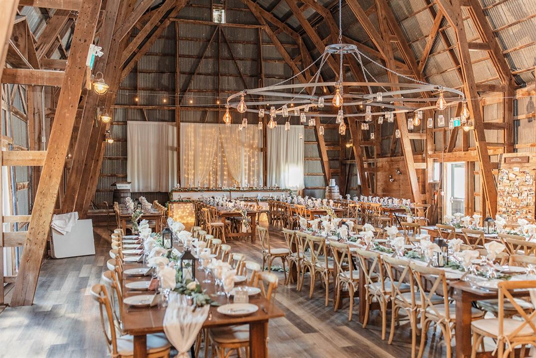 Accommodating up to 200 guests, its two large windows and automatic doors invite in the country breeze and offer stunning views of Lake Huron's sunsets. Greeted by a grand deck and twinkling string lights, guests can enjoy the 25-acre surroundings. Inside, dance on beautifully redone floors, beneath lofty ceilings, and a unique chandelier, surrounded by romantic lighting.