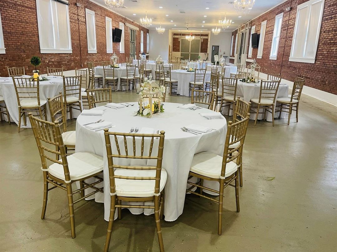 The Railway Express Agency (REA) seats 250 people. We provide 25 round tables and 250 gold chivari chairs. Full size commercial grade kitchen complete with 2 refrigerators, 2 sinks, 2 microwaves, 4 stainless steel preparation tables, commercial ice machine and 2 stove/oven combos. There are 4 restrooms available with handicap stalls. The building is handicap accessible. 4 smart TV's, 1 projector, handheld microphone and clip on microphone available. Covered, outdoor patio with a beautiful fireplace (non-functioning) that comes with 6 cocktail tables. Indoor bar (not stocked).