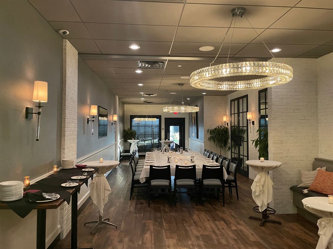The private dining room located just One Door West of Gianni's Steakhouse. The room holds up to 36 guests for a seated dinner and up to 45 guests for a standing room reception. The maximum with AV capabilities is 22-24 guests.