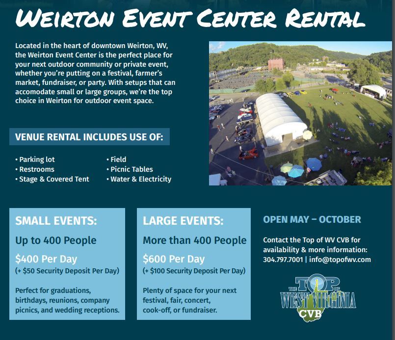 When you choose the Weirton Event Center, you're not just selecting a venue. With no hidden fees or charges, our transparent rental packages cover everything you need to bring your vision to life. From ample parking to stage and field access, indoor tent areas, and utilities, we provide the essentials to ensure your event runs seamlessly from start to finish. Contact us today to explore our rental options, check availability, and discover how we can collaborate to make your event a resounding success. Whether you're planning a small-scale gathering or a large-scale extravaganza, the Weirton Event Center is here to exceed your expectations and create memories that last a lifetime.