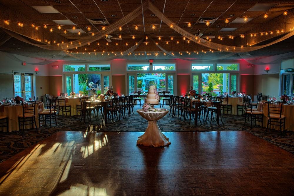 The Maine Ballroom accommodates up to 200 people with a dance floor and room for your band or DJ. It features French Doors with delightful views of the gardens and an expanse of windows for natural light. The neutral decor will complement any color or theme. All of our packages include Chivari chairs, floor length linen, displayed and passed hors d’oeuvres, champagne toast and a custom designed Wedding Cake. We offer a wide variety of menu selections and will customize to suit your wishes for your full service buffet or plated dinner. Upstairs in our Conference Center, the York Room, seats up to 60 guests for your Rehearsal Dinner and/or Farewell Breakfast. Ask for more information about those menus!
