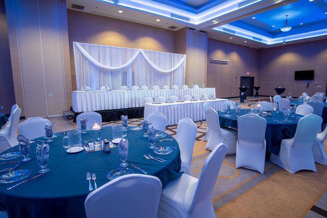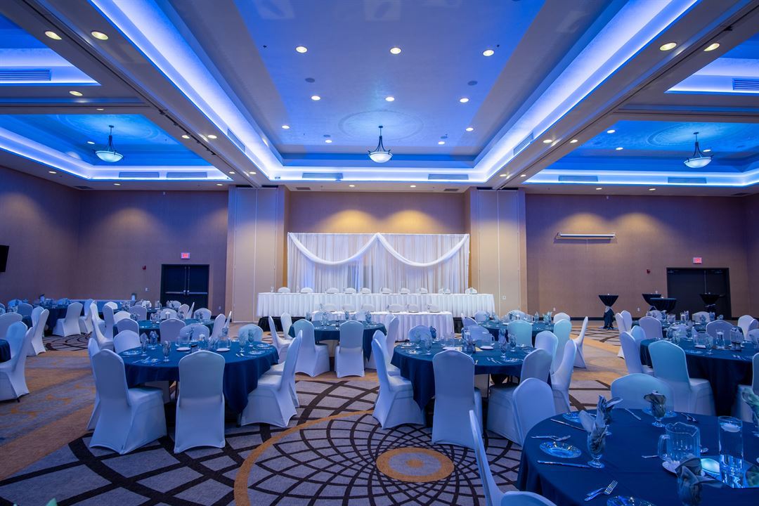 The Grand Ballroom with its extra high ceilings and colored LED lighting is the perfect backdrop to the theme you choose for your special day. Spacious pre-function space can be utilized to greet your guests and a full-service bar with access from both the pre-function space and the interior of the Ballroom is available.