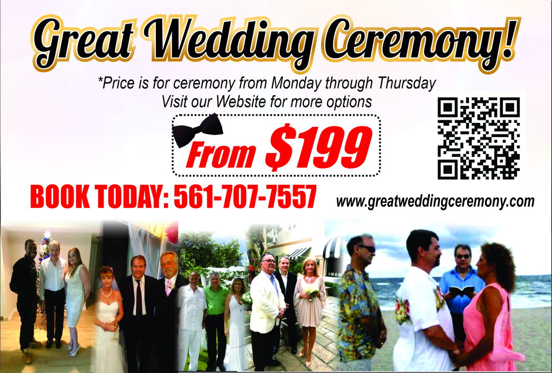 Deposit of 50% required and balance of payment is due on or before date of ceremony. Full refund honored until 14 days before event. Payment accepted by cash, check or invoice. Discount ($199) for ceremonies performed Monday-Thursday.