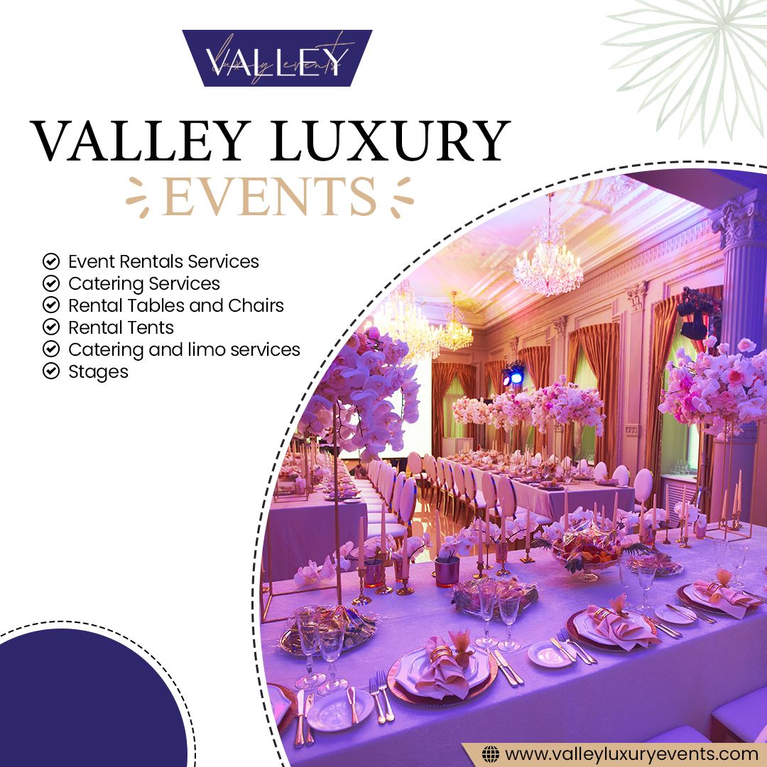 Valley luxury Events is a locally owned, full-service event planning and party rental company. We provide party rental, event planning, coordination, catering, and limo services all around Sacramento. Our extensive rental product offerings include a full complement of tents, tables, chairs, lots of party accessories, event rentals, party rentals, rentals tents, catering, party/event linens, and a lot more. We create beautiful and functional spaces with our distinct rentals, thoughtful event designs, and truly personalized services.