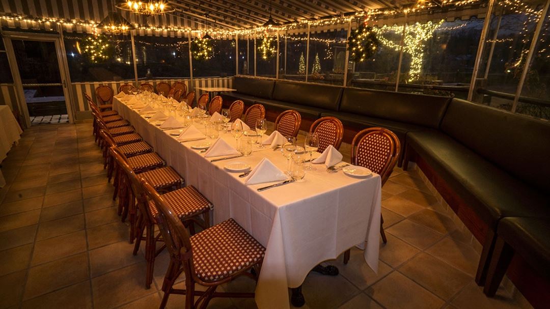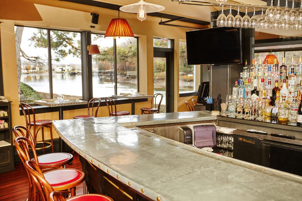 The dining room, with a wrap-around wall of windows overlooks a bend in the river, there is a fireplace for winter, and in warm weather there is an outdoor patio that feels like a cafe on the Seine.