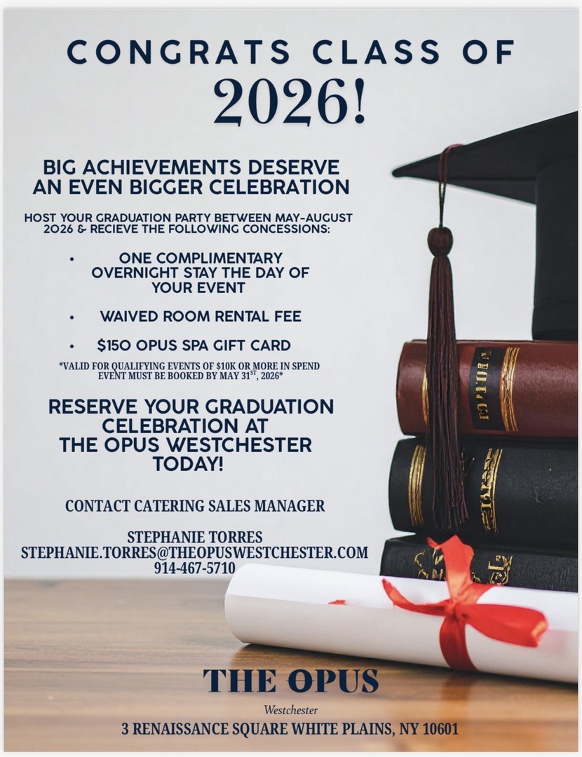 The Opus, Westchester lies in the heart of White Plains, New York. The hotel features 146 luxury guestrooms, including 38 suites, The Opus Ballroom, and six versatile meeting rooms. Guests of The Opus, Westchester will experience a world class hotel stay as we provide the finest services and amenities in the tristate area.
