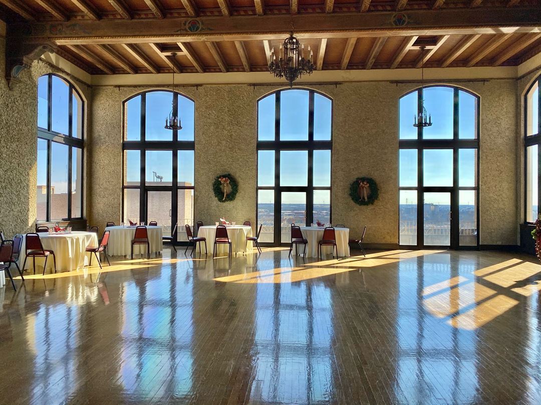 The Hamilton Ballroom sits high atop the historic Hamilton Building in downtown Wichita Falls. This magnificent room is two stories in height with hand painted exposed beams, original hardwood floors, large fireplace and windows stretching nearly to the ceiling. Occupying the east end of the 12th floor, the Ballroom offers sweeping views of the city.