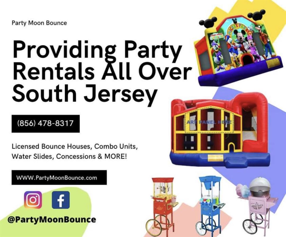 Party Moon Bounce has taken the stress out of throwing a party by making the process fun and easy. We offer commercial grade bounce house rentals, inflatable waterslide rentals and cartoon mascot character appearances. We even have fun treats with our concession machine rentals. Visit our website Partymoonbounce.com where you can browse our inventory, check prices and availability, as well as make a reservation! If you're not computer savvy that's okay, our friendly staff will gladly help you by phone. Each inflatable rental is cleaned and sanitized before and after each use to ensure the safety of you and your guests. We understand that bounce house rentals are a must have at any event. So no matter the occasion Party Moon Bounce has you covered! Proudly delivering fun to South Jersey!