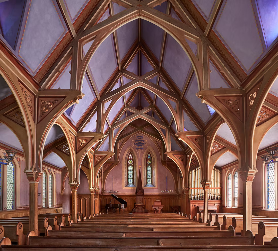 Imagine the beauty of stained glass windows, soaring arches, ornate frescoes – and a real steeple bell to ring to celebrate your special day. Thacher Hall is the place. Our beautiful Audience Room is the showcase of our 1870 building, a former church that is now a secular community venue in the historic heart of Yarmouth Port, Massachusetts. It seats up to 130 people and has up-to-date lighting, sound, heating and cooling. We are close to several highly rated inns and restaurants. Let us know how we can help plan your special day.