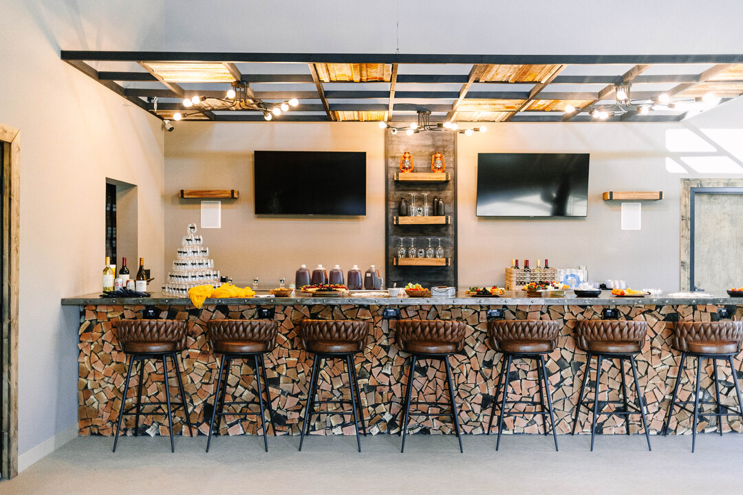 Separate lounge area with a bar (The Raille Lounge) featuring wooden high-top table