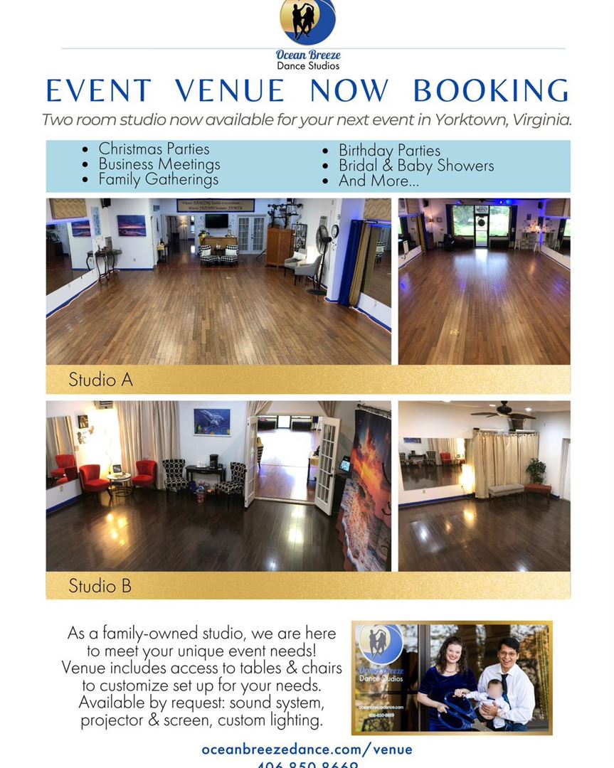 Ocean Breeze Dance Studios is the perfect place for your next event! Whether hosting an event with an open floor plan (dances, self-defense classes, cheerleading, modeling), a meeting or class requiring seating layout, or studio setting for photography sessions, this space is very customizable! Our front room is 1250 sq ft, and back froom is an additional 625 sq ft. We have hosted weddings, bridal and baby showers, birthday parties, family gatherings and holiday parties, dance/cheerleading/fitness classes, art classes, portrait photography sessions, business and networking groups, church groups, and more, and we are excited to help customize to meet your specific needs. Two bathrooms. No full kitchen.