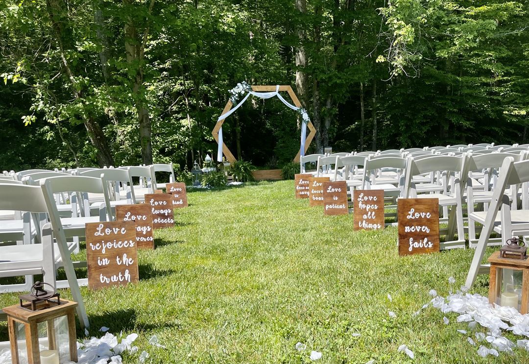 Forget Me Knot is a unique rustic-chic wedding and event venue located on the edge of the scenic Hocking Hills State Park in Ohio. The venue can host all types of events and can accommodate seating for up to 150 people. The rustic nature of the building allows easy decoration for many different kinds of events. A large space beyond the hall can be used for outdoor weddings and events.