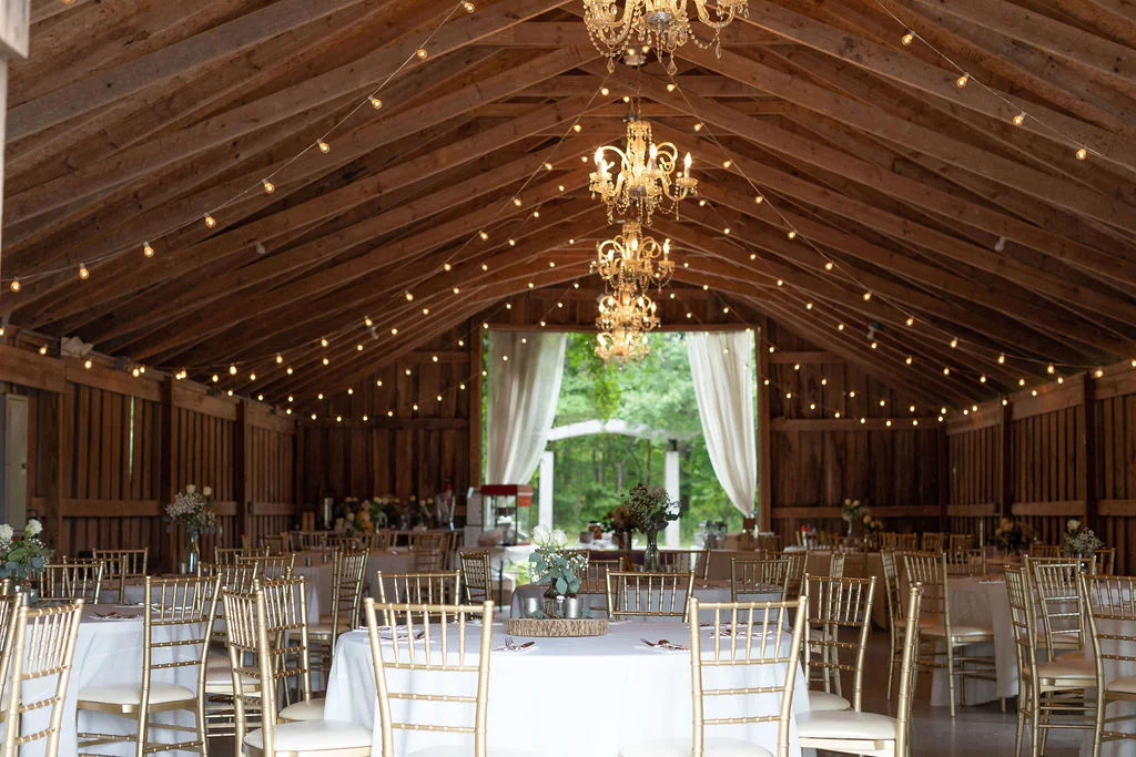 The 1,800 square foot barn is complete with concrete floors, 5 hanging chandeliers, vintage bulbed lights, 9 authentic whiskey barrels, 4 spools, a pallet bar, wood slices for centerpieces, tables and 150 gold chiavari chairs for your reception, 150 white padded resin chairs for your ceremony, and gorgeous 14 foot chiffon drapes. The property has a great fire pit to add some fun to the end of your reception too!